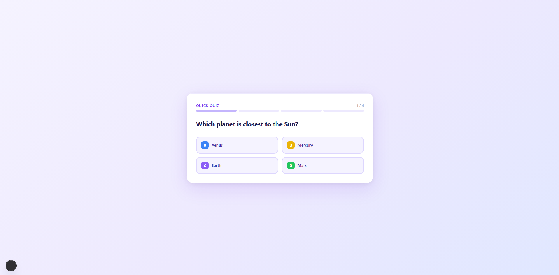 Playful Quizlet-style quiz with colorful answer cards and smooth animations.